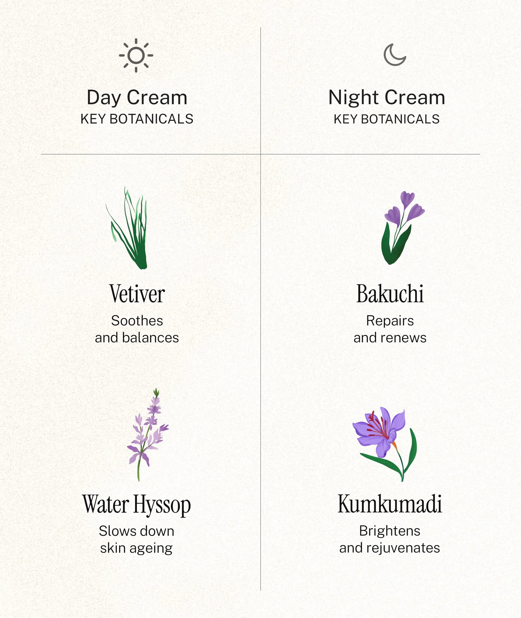 Perfect for gifting or personal indulgence, the thoughtfully crafted duo blends Ayurvedic wisdom with modern skincare needs. The Day Cream infuses your skin with refreshing moisture and natural SPF protection, while the Night Cream works deeply while you sleep to repair, nourish and replenish.