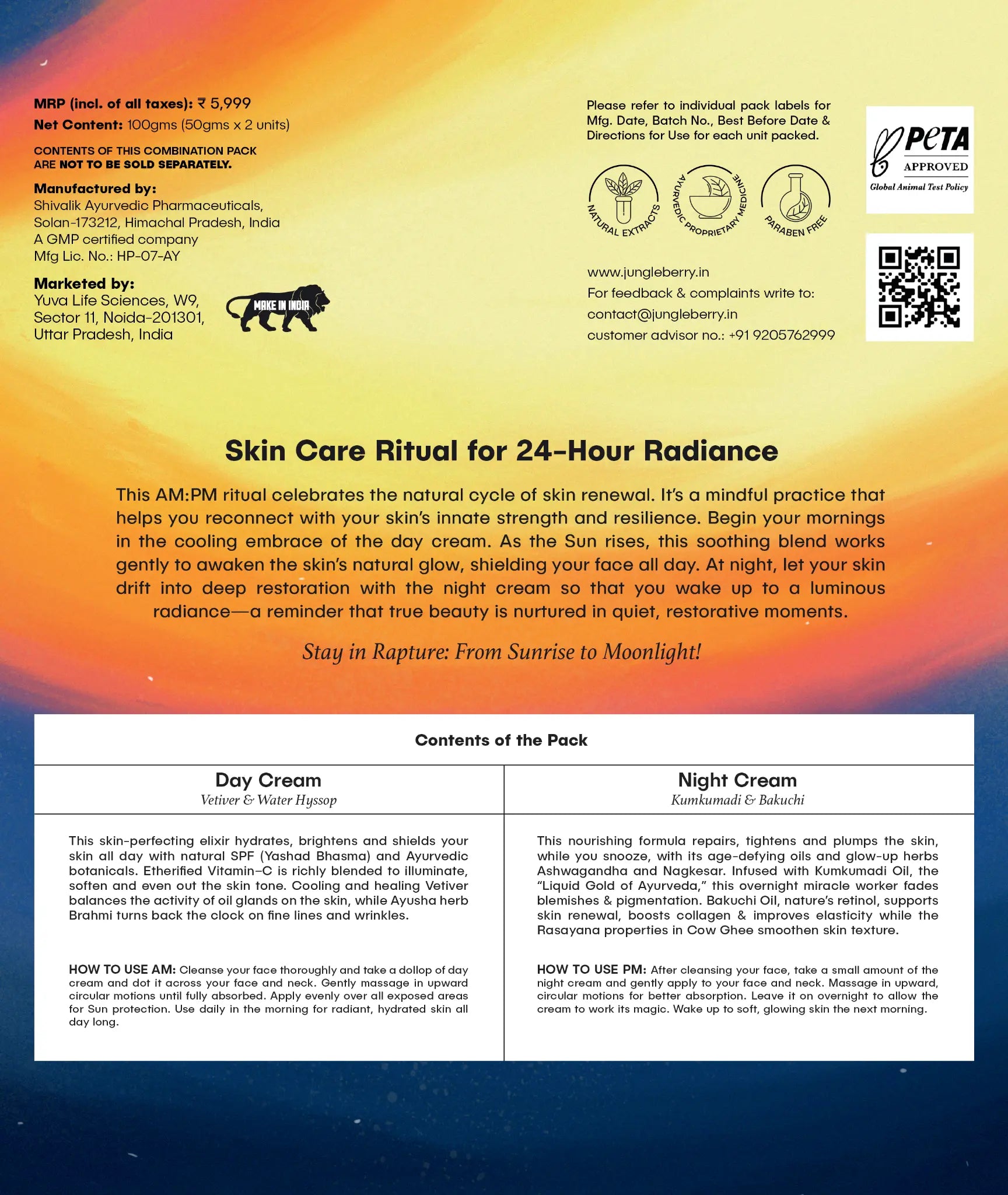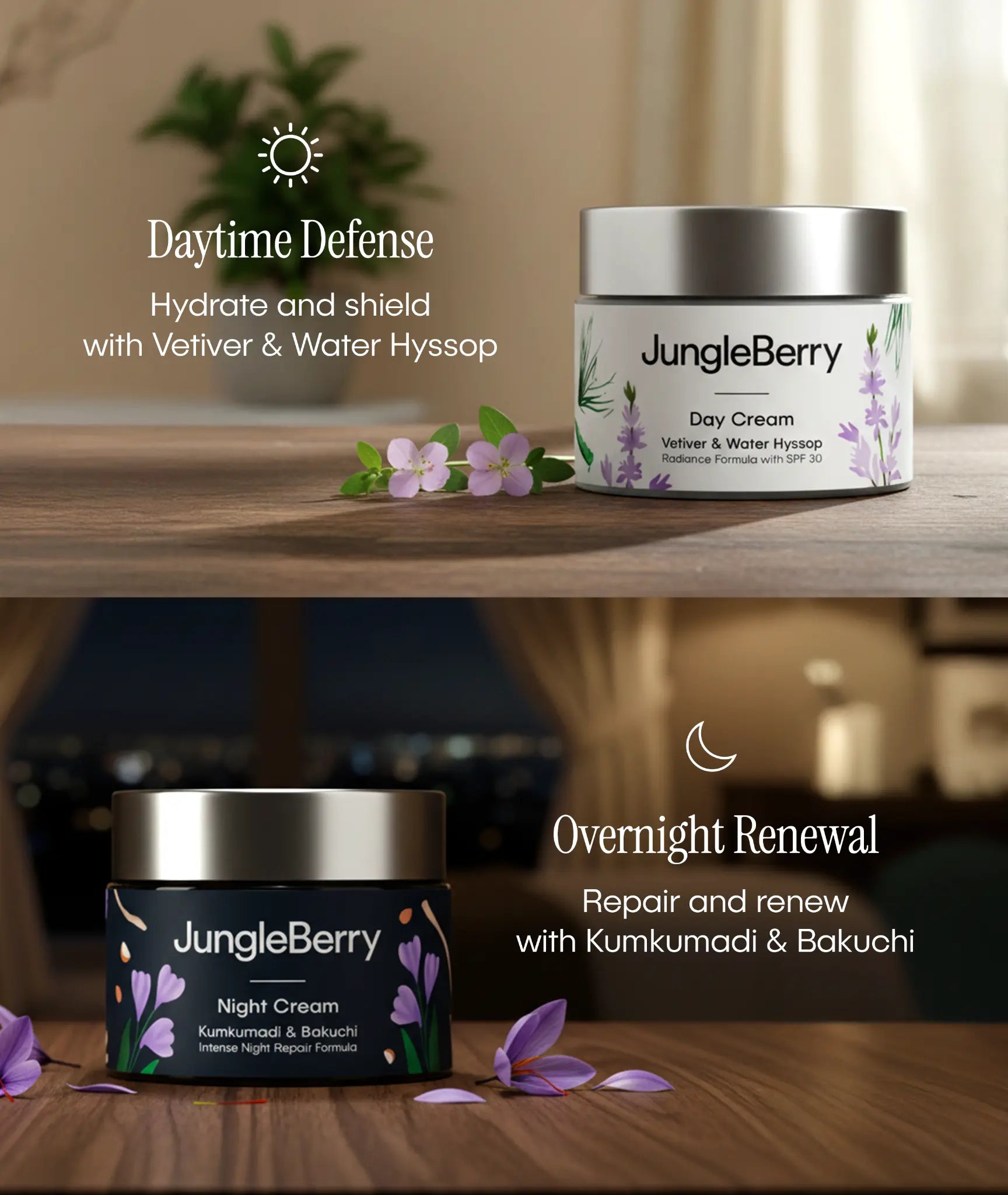 JungleBerry Rapture: Dawn & Dusk Skincare Gift Box | For Men & Women | With Vetiver & Water Hyssop Day Cream and Kumkumadi & Bakuchi Night Cream | 2-Piece Daily Skincare Set for All Occasions