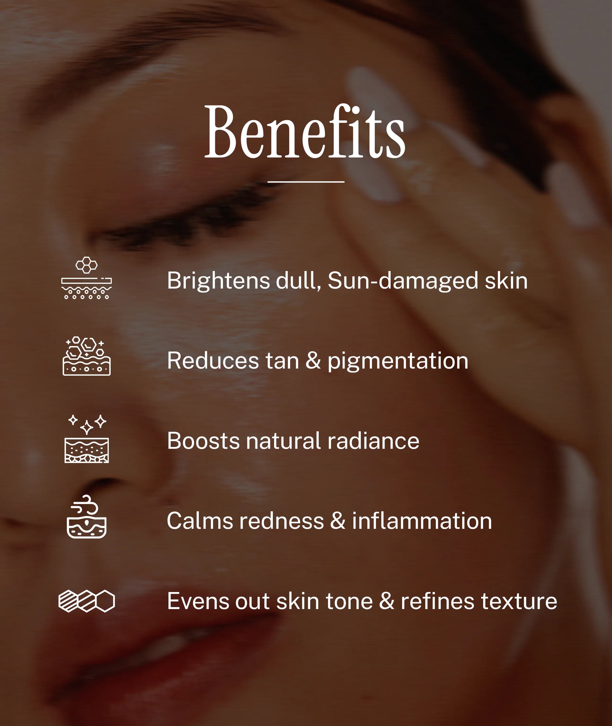 3-O-Ethyl Ascorbic Acid, two clinically backed brightening agents, to improve elasticity, boost collagen and fade pigmentation. No silicones or synthetic complexion enhancers; your daily plant-powered purity for a skin reset.