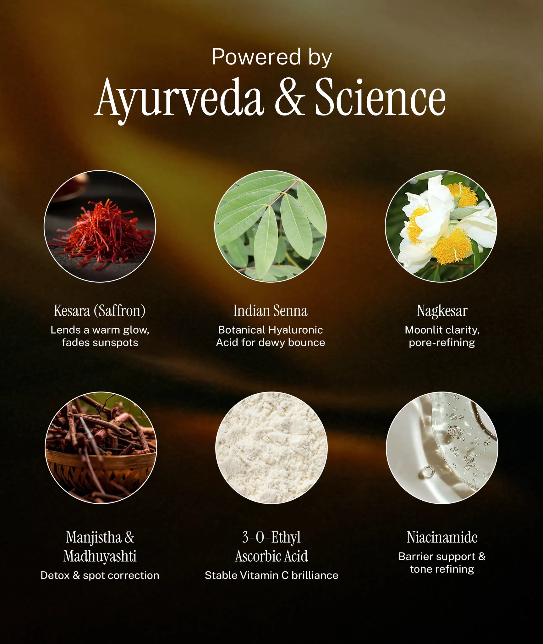 This Vitamin C–rich golden elixir designed to brighten, de-tan and repair the skin has been formulated using glow-reviving Ayurvedic botanicals like Kesar, Manjistha, Swarnapatri and Madhuyashti. Lightweight and non-sticky, the serum glides