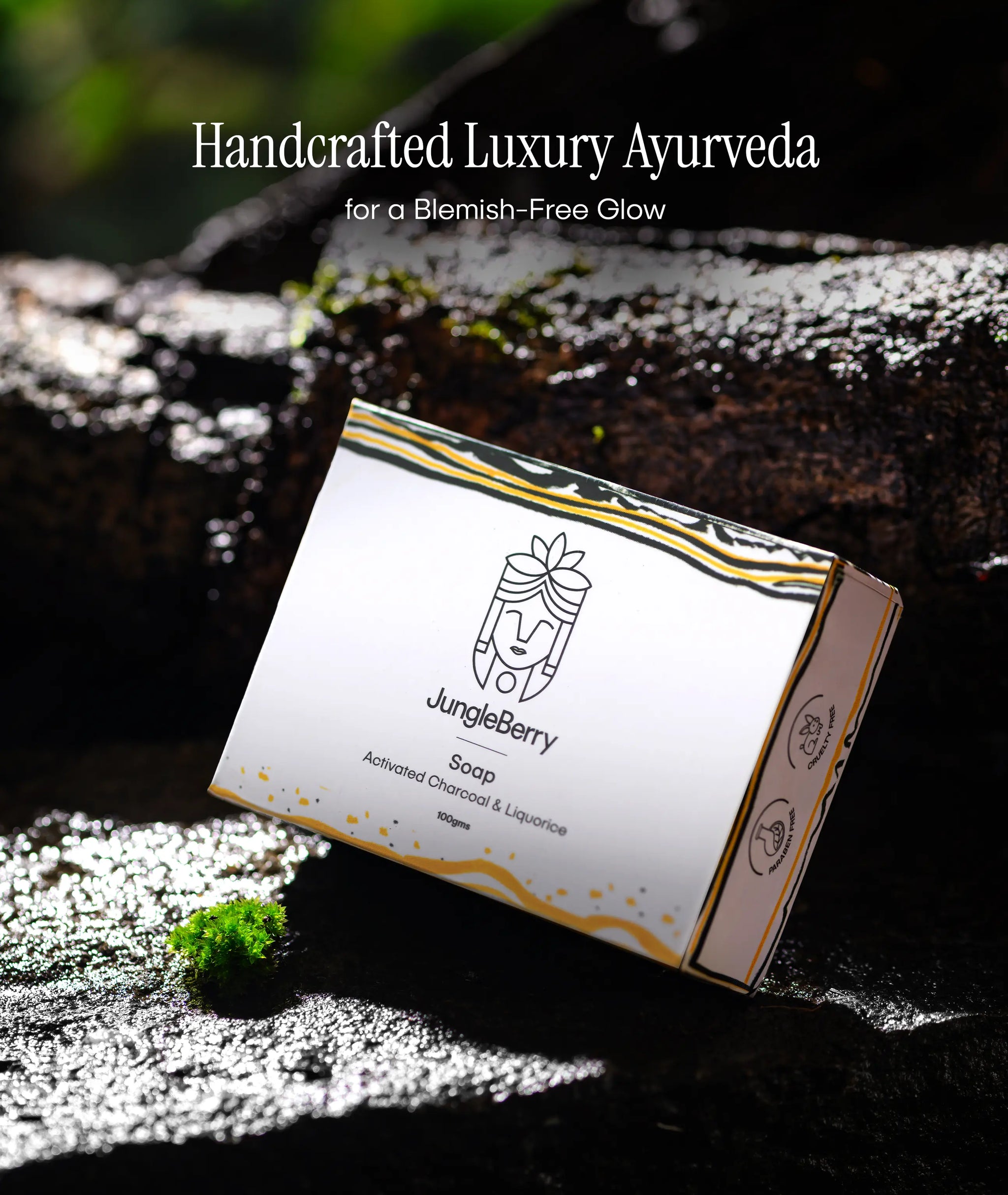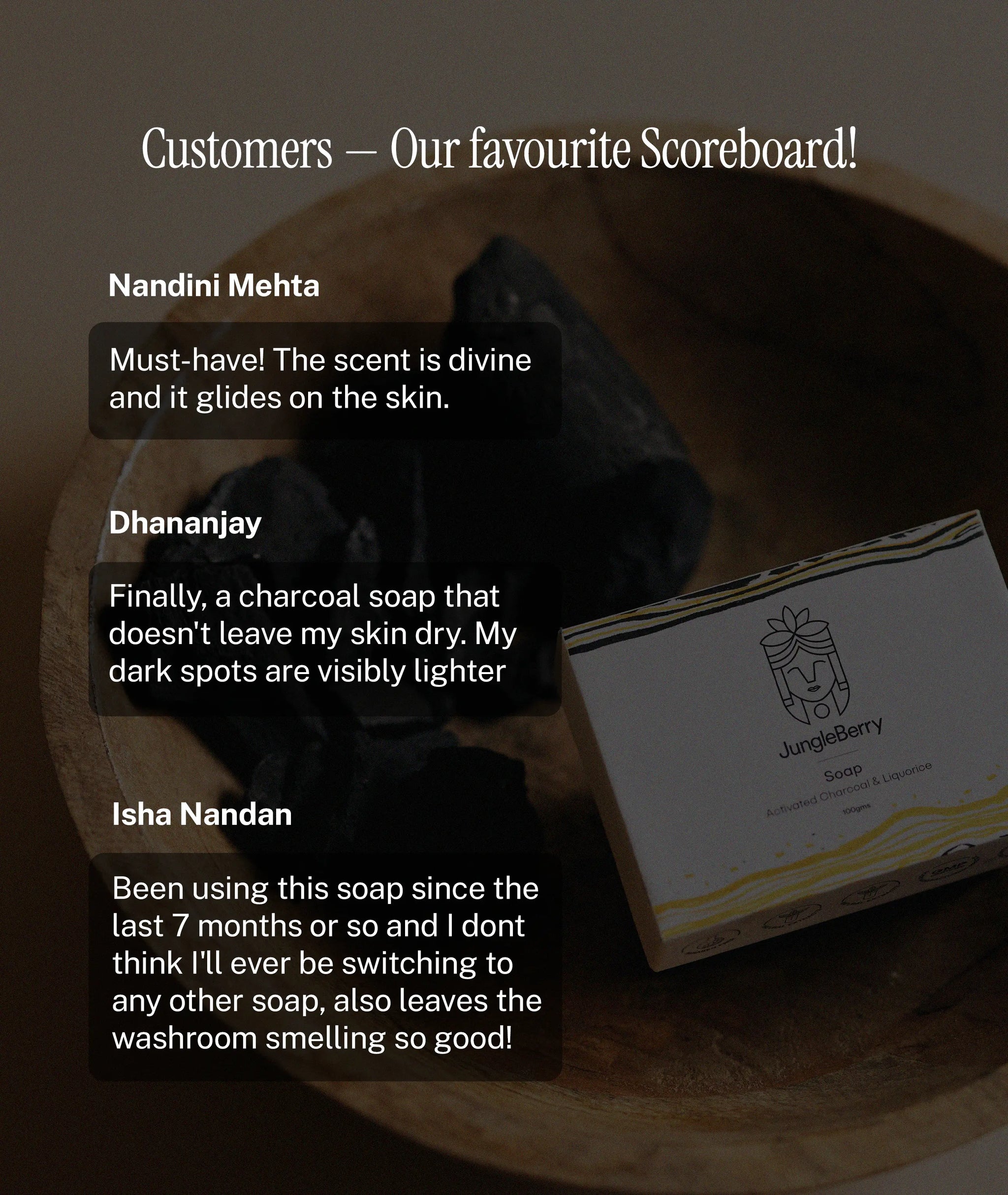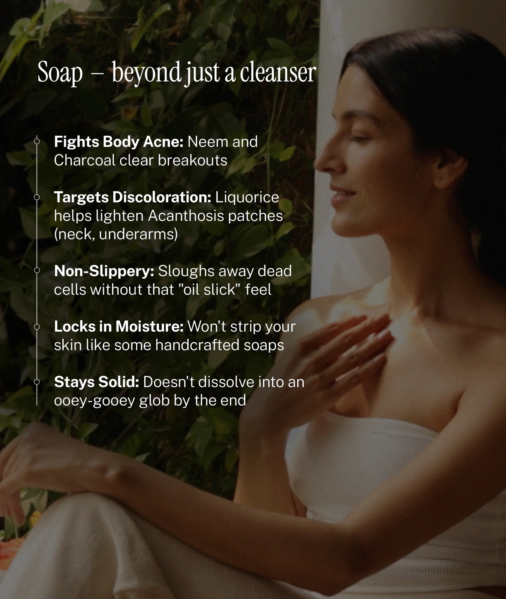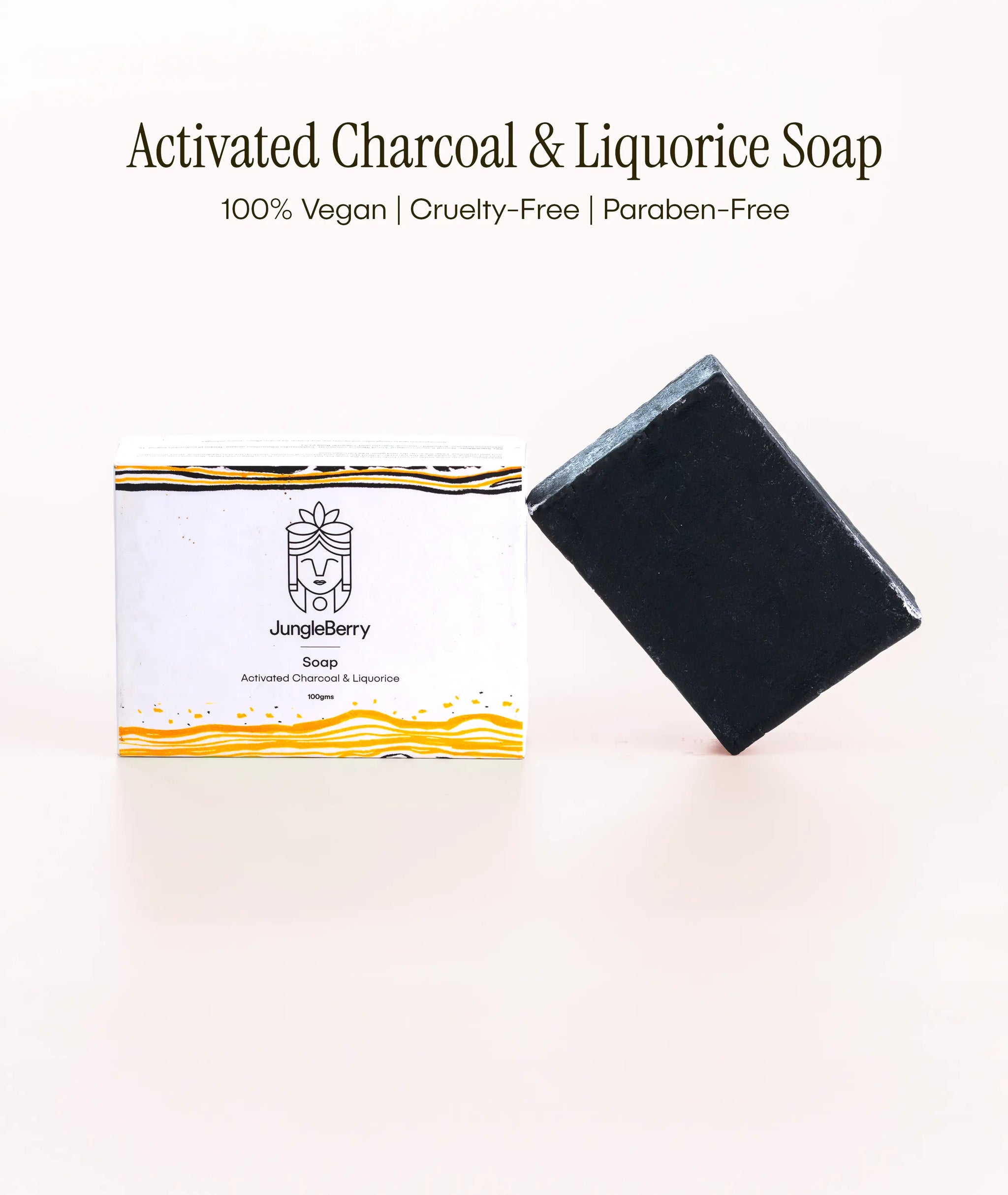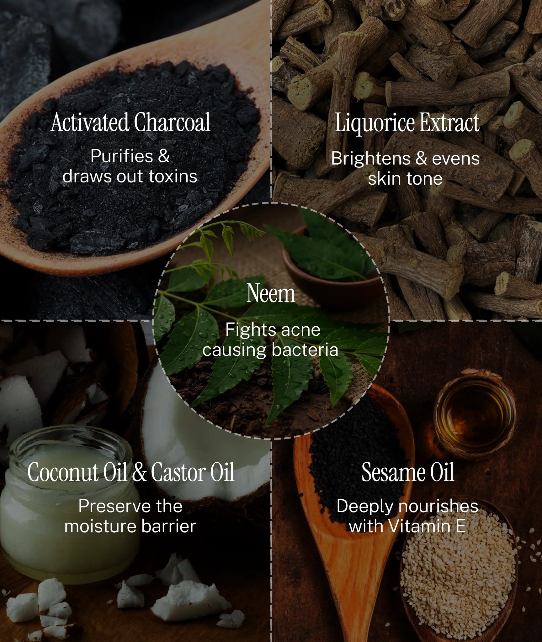 The Activated Charcoal & Liquorice Soap contains Neem and Madhuyashti extracts, which reduce blemishes and fight acne. A sensory experience awaits you with this handcrafted soap that offers a balance of fun bubbles and a soothing, creamy texture, leaving your skin feeling clean and soft. An instant rinse sloughs away dead skin cells without giving that slippery, soapy feeling. The optimal blend of Coconut Oil, Castor Oil and Sesame Oil preserves skin moisture, and the soap bar remains solid even to the smallest sliver, without fizzling down to an ooey-gooey glob.