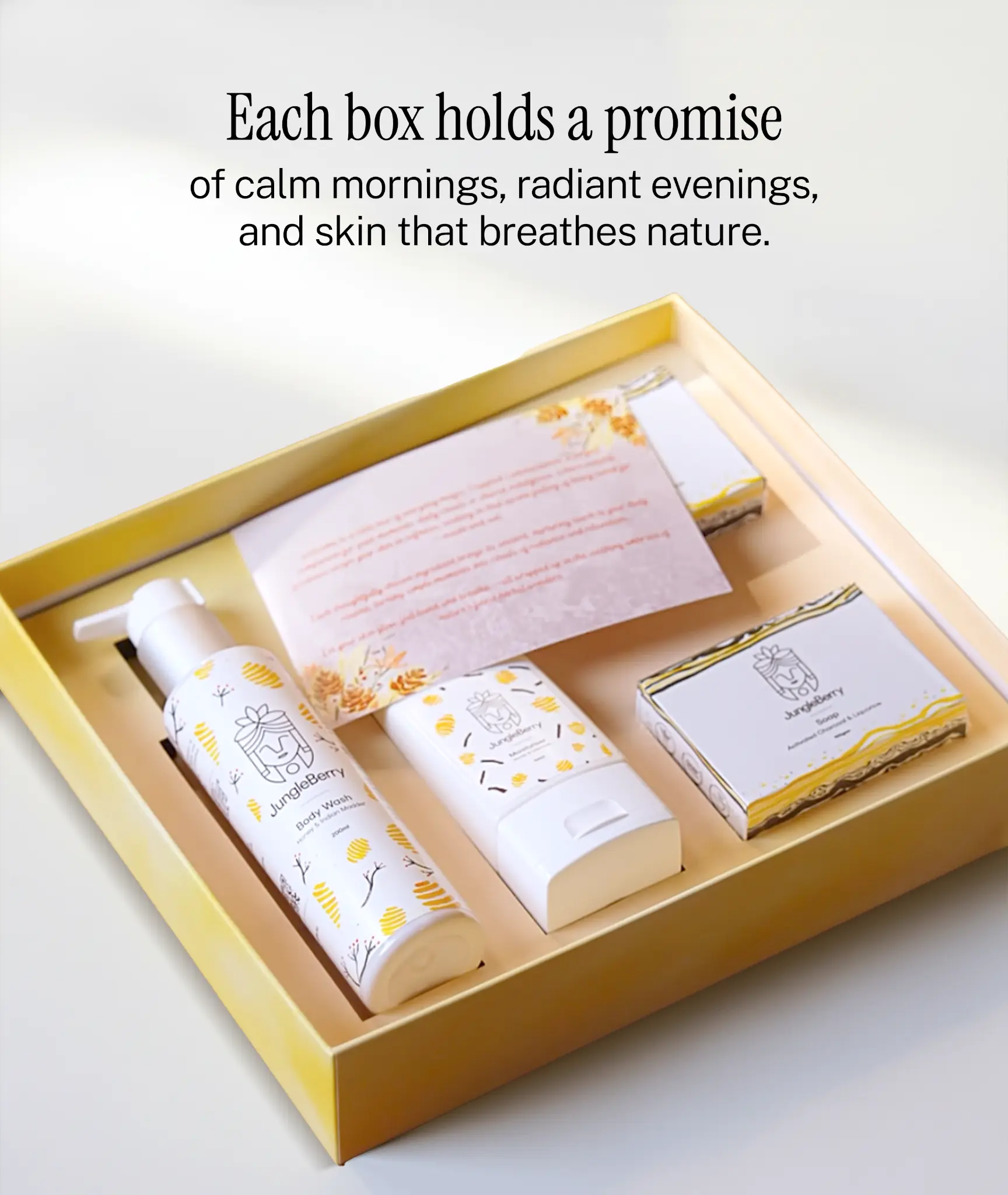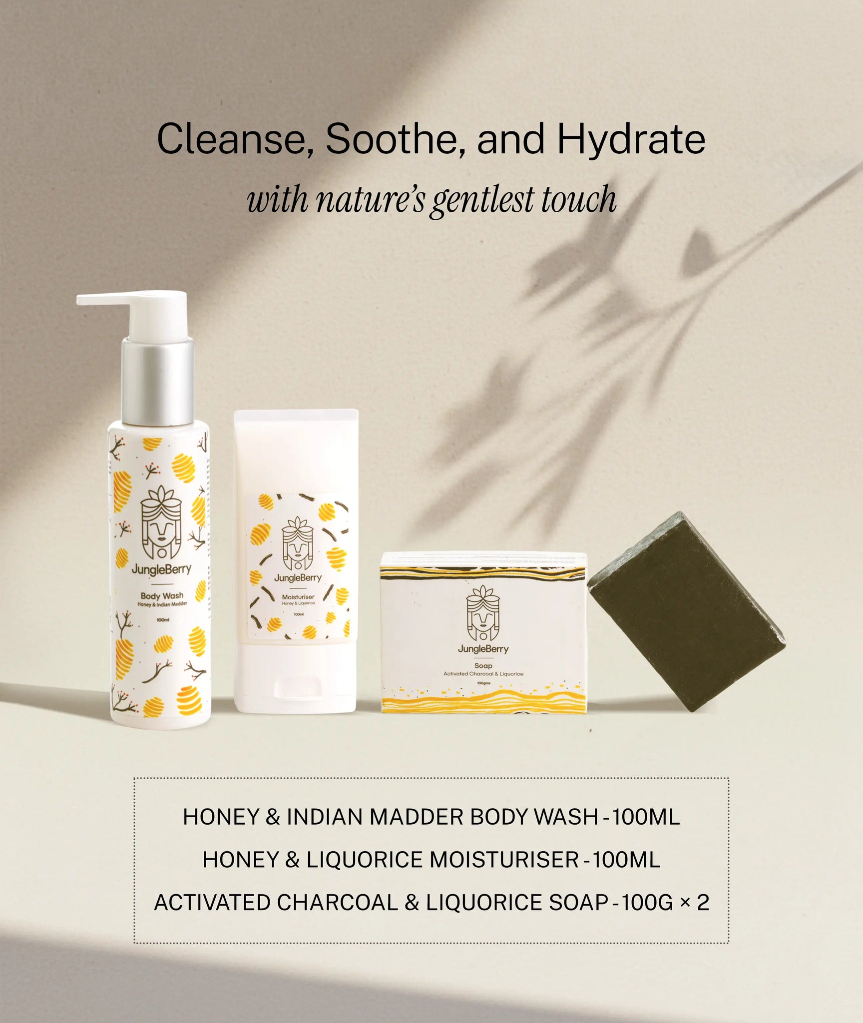 JungleBerry Dappled Luminescence Daily Skincare Ritual Gift Box | For Men & Women | With Honey & Indian Madder Body Wash, Honey & Liquorice Moisturiser, and Activated Charcoal & Liquorice Soaps | 4 Piece Gift Set for All Occasions.