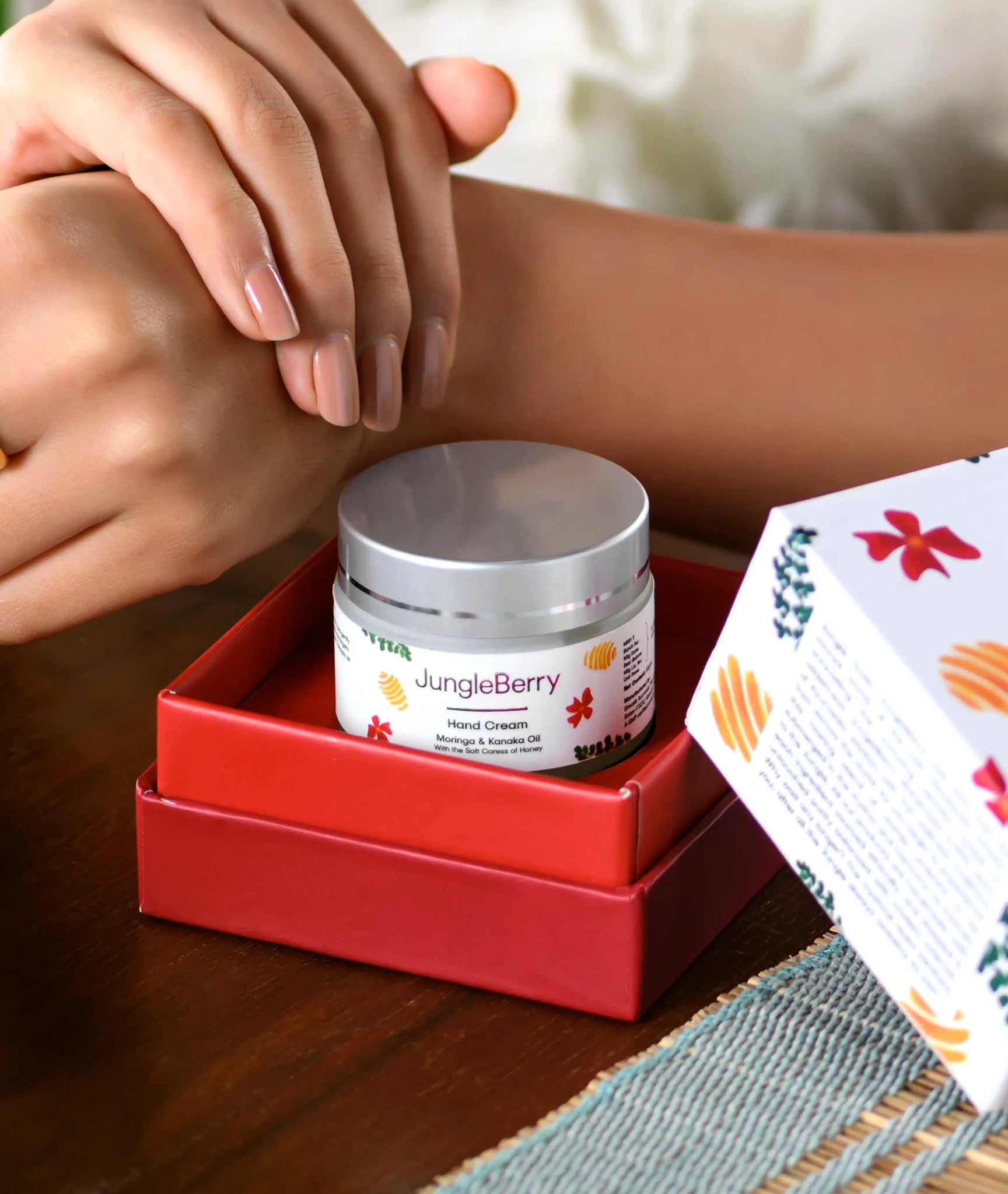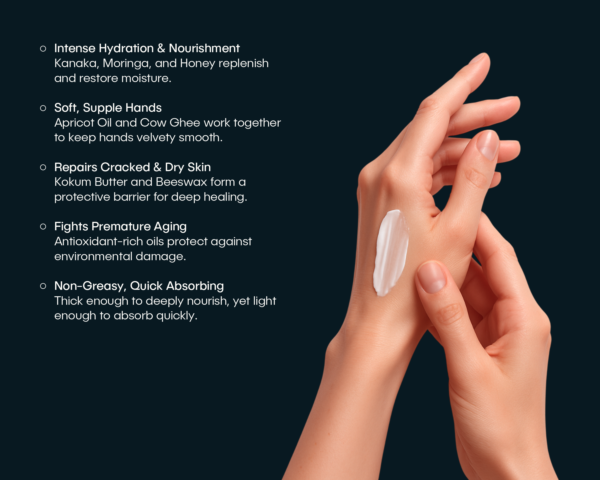 The JungleBerry Hand Cream is a classic Ayurvedic formulation packed with goodies—antioxidants, skin-brighteners, humectants and soothing ingredients—to transform your hands into soft, supple perfection. It is chock full of Moringa, a miracle herb with Vitamins A, C & E that work wonders for your dry, tired hands. Enriched with Kanaka Oil, a vintage Ayurvedic staple, it promotes healing and ensures that your hands stay nourished and cuticles don’t tear. Coconut Oil soothes dry and irritated skin, while Olive Oil smoothens texture, leaving the hands velvety soft. Infused with Cow Ghee, known for its Rasayana properties, this cream deeply repairs and hydrates. Kokum Butter and Beeswax form a protective barrier, shielding the skin from harsh elements even as Honey locks in moisture and improves complexion.