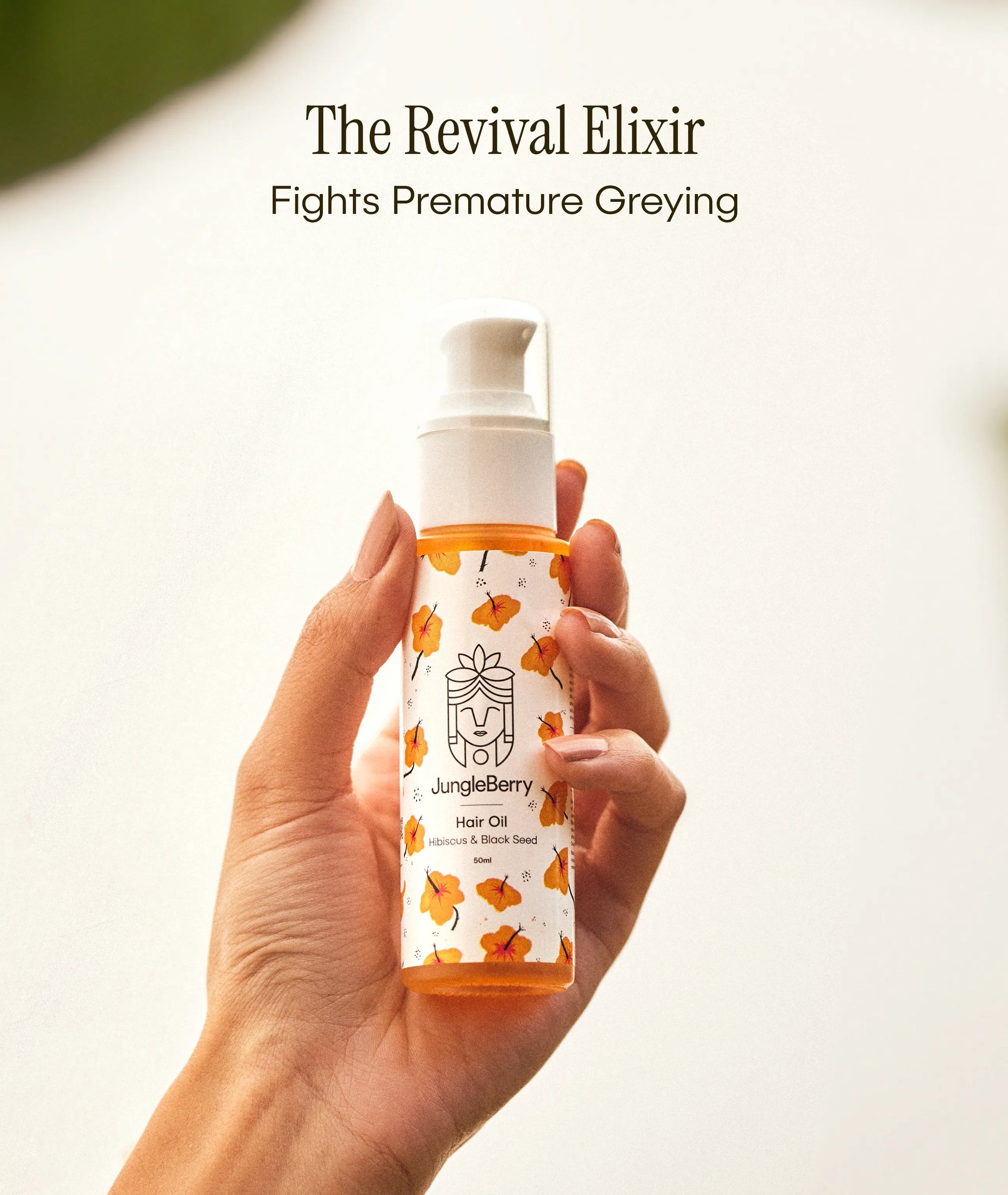 JungleBerry’s deeply moisturising cold-pressed Hibiscus & Black Seed Hair Oil is enriched with oodles of Kalonji or Black Seed, which is used in Ayurveda to delay premature greying. It seals moisture in the hair shaft and nourishes hair follicles so that they can grip the hair better. Rich in fatty amino acids, the oil removes frizz and gives the tresses a deep-conditioned, glossy shine. The goodness of Hibiscus, Rosemary Oil and Vitamin E strengthens the hair and prevents breakage. This hair care wonder is a powerhouse of infused essential oils, including Coconut Oil, Sesame Oil, Olive Oil and Almond Oil—all of which are excellent sources of antioxidants.
