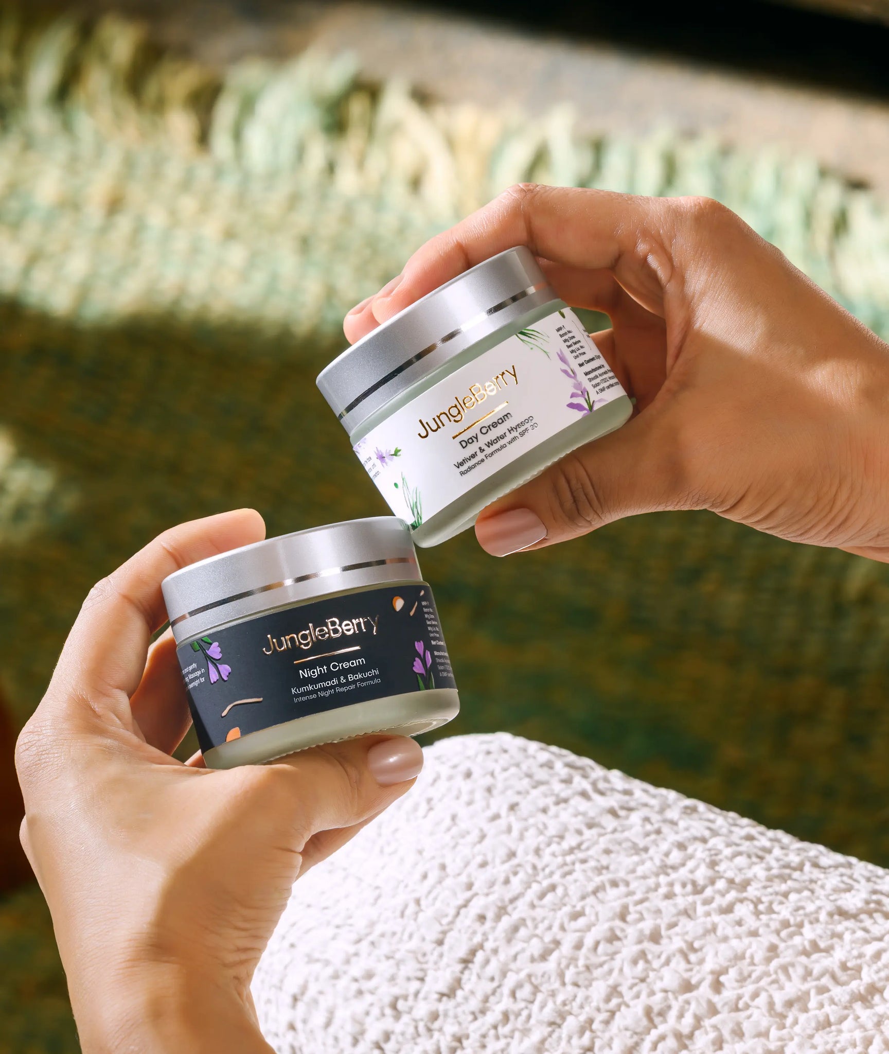 The JungleBerry Kumkumadi & Bakuchi Cream is an overnight miracle worker, blending ancient Ayurvedic wisdom with luxurious care. It has a rich blend of skin-brightening herbs, including Ashwagandha and Nagkesar, making your face glow with youthful vitality. Infused with Kumkumadi Oil, the “Liquid Gold of Ayurveda,” this powerhouse formula targets fine lines and wrinkles, effecting dermal rejuvenation while you snooze. Enriched with Cow Ghee, it restores skin radiance, ensuring a soft, smooth texture by morning. Bakuchi Oil—a revered Ayurvedic wonder often called nature’s retinol—supports skin renewal, improves elasticity and reduces dark spots. The infusions of Almond Oil and Rose Water deeply hydrate, fighting pigmentation and leaving the skin fresh and plump.